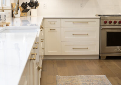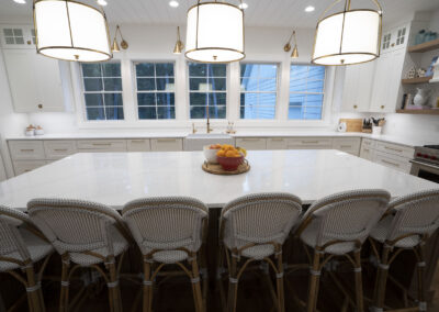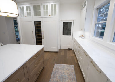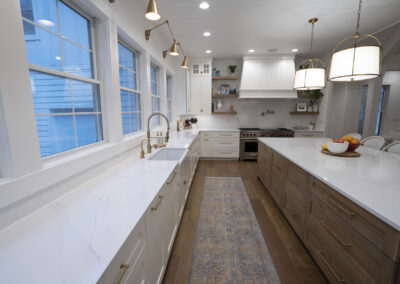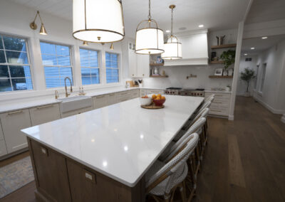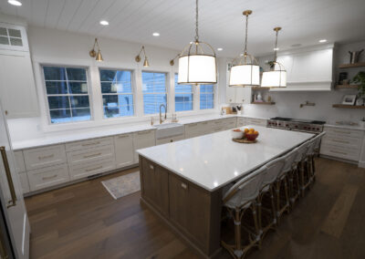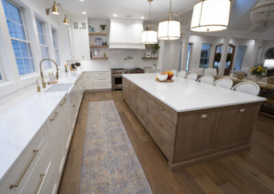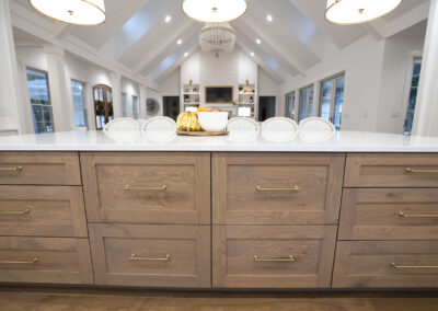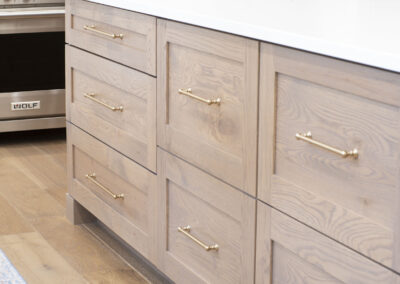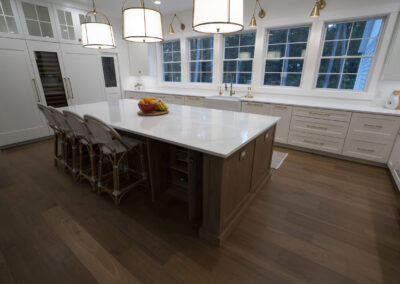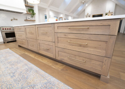 The contrasting island sports a custom stain on rustic white oak to match the flooring.