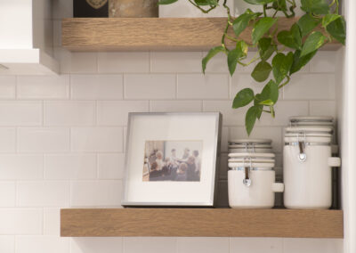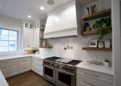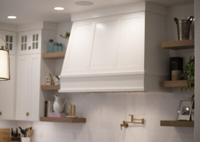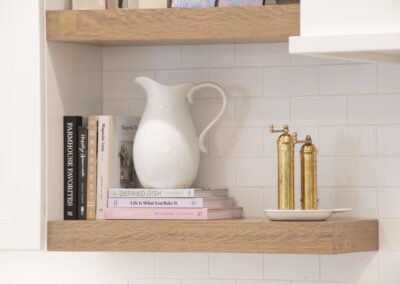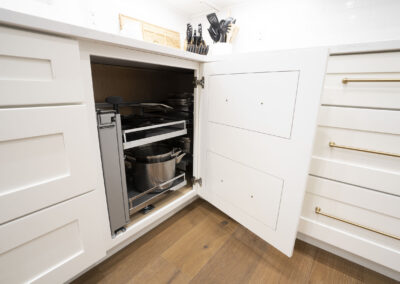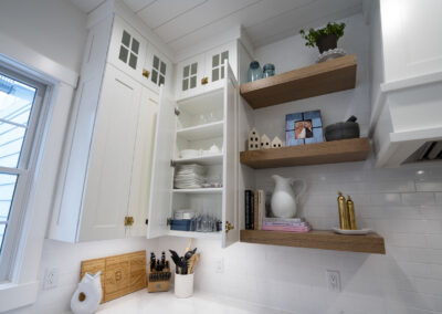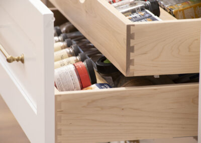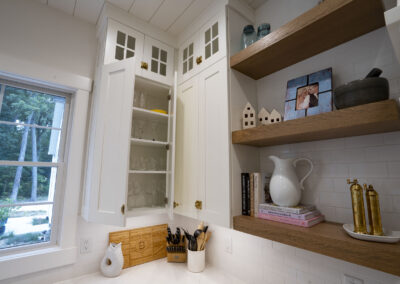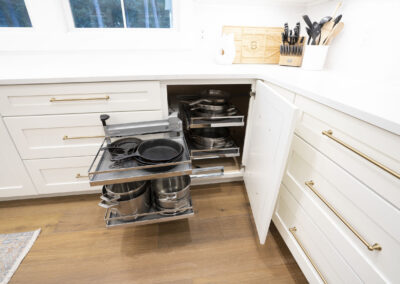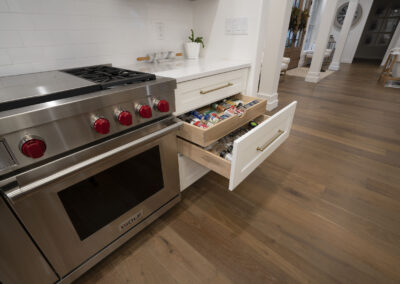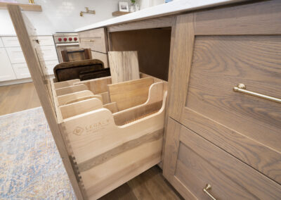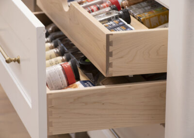 Lots of custom storage options include a Hafele Magic Corner pullout, custom tray divider drawer, a custom double-tier spice drawer system.  To complement the cabinets and counters, custom floating shelves match the island.  Hafele under-cabinet lighting by Legacy Wood Creations.